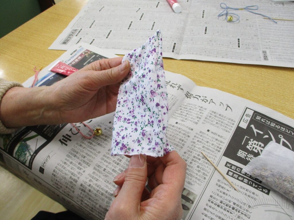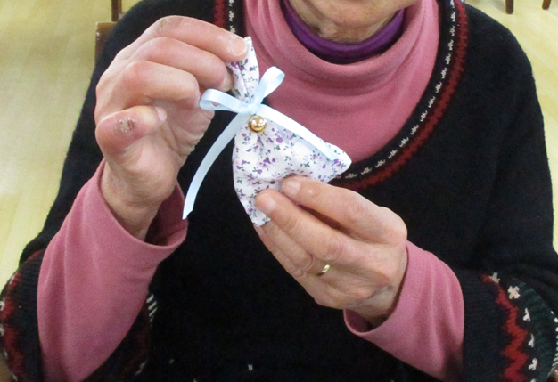 利用者様には ①布にボンドを付けて袋にする ②袋に乾燥したラベンダーを入れる ③リボンで袋の口を縛る の工程をおこなっていただきました。