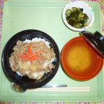 ◇牛丼 ◇胡瓜の酢の物 ◇味噌汁 エネルギー703kcal たんぱく質26.8g 脂質20.2g 炭水化物99.0g 食塩3.8g