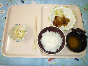 2019年7月17日(水) 2019/7/17 メニュー, 鶏肉 ◇ご飯 ◇鶏肉の香草焼き ◇洋風サラダ ◇コンソメスープ エネルギー614kcal たんぱく質22.0g 脂質19.2g 炭水化物84.6g 食塩2.4g