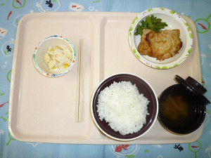2019年7月30日(火) 2019/7/30 メニュー, 鶏肉 ◇御飯 ◇チキンステーキ ◇洋風サラダ ◇コンソメスープ エネルギー675kcal たんぱく質26.5g 脂質24.2g 炭水化物85.1g 食塩2.8g