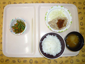 2019年9月25日(水) 2019/9/25 メニュー, 豚肉 ◇御飯 ◇豚肉のオニオンソース ◇柚子醤油和え ◇味噌汁 エネルギー697kcal たんぱく質29.4g 脂質22.1g 炭水化物90.2g 食塩3.6g