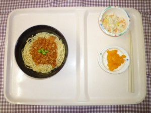 2019年11月28日(木) 2019/11/28 メニュー, 豚肉 ◇ミートソーススパゲティ ◇シーザーサラダ ◇みかん缶 エネルギー700kcal たんぱく質28.4g 脂質23.5g 炭水化物88.8g 食塩4.7g