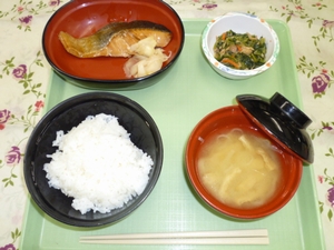 2013年5月21日(火) 2013/5/21 メニュー ◇御飯 ◇鮭の照り焼き ◇ほうれん草とツナの和え物 ◇味噌汁 エネルギー615kcal たんぱく質33.5g 脂質14.5g 炭水化物83.7g 塩分3.9g