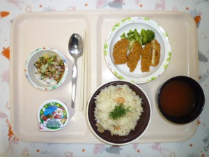2019年12月24日(火) 2019/12/24 メニュー, 鶏肉 ◇海老ピラフ ◇フライドチキン ◇サラダ ◇トマトスープ ◇チョコムース エネルギー904kcal たんぱく質26.2g 脂質37.5g 炭水化物113.6g 食塩6.2g