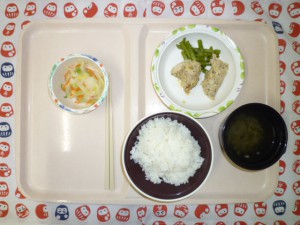 2020年1月6日(月) 2020/1/6 メニュー, 鶏肉 ◇御飯 ◇鶏のマスタード焼き ◇洋風サラダ ◇コンソメスープ エネルギー659kcal たんぱく質22.1g 脂質25.7g 炭水化物80.5g 食塩2.6g