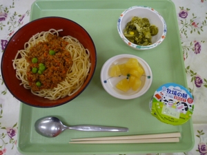 2013年5月30日(木) 2013/5/30 メニュー ◇ミートソーススパゲティー ◇マリネサラダ ◇フルーツ ◇ヨーグルト エネルギー697kcal たんぱく質35.7g 脂質17.7g 炭水化物96.8g 塩分3.0g