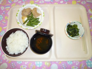 2020年4月6日(月) 2020/4/6 メニュー, 鶏肉 ◇御飯 ◇鶏肉の味噌漬け焼き ◇ごま醤油和え ◇清汁 エネルギー573kcal たんぱく質22.6g 脂質14.2g 炭水化物85.3g 食塩2.6g