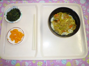 2020年4月30日(木) 2020/4/30 メニュー, 豚肉 ◇カレーうどん ◇ほうれん草のおかか和え ◇みかん缶 エネルギー587kcal たんぱく質26.4g 脂質20.1g 炭水化物73.1g 食塩3.9g