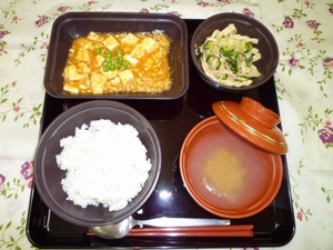 2010年11月24日(水) 2010/11/24 メニュー ◇御飯 ◇豆腐のチリソース風 ◇カニ風味サラダ ◇中華風コーンスープ エネルギー604kcal たんぱく質25.3g 脂質11.8g 炭水化物95.3g 塩分2.9g *参考