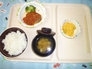 2020年8月25日(火) 2020/8/25 メニュー, 豚肉 ◇御飯 ◇トマトハンバーグ ◇フレンチサラダ ◇コンソメスープ エネルギー562kcal たんぱく質19.5g 脂質21.8g 炭水化物94.4g 食塩3.1g