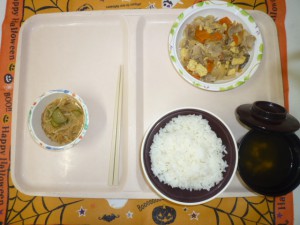 2020年11月1日(日) 2020/11/1 メニュー, 豚肉 ◇御飯 ◇豚肉と卵の中華炒め ◇中華サラダ ◇中華スープ エネルギー642kcal たんぱく質25.7g 脂質19.3g 炭水化物88.5g 食塩3.2g