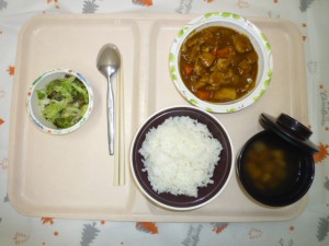 2020年12月16日(水) 2020/12/16 鶏肉 ◇御飯 ◇チキンカレー ◇グリーンサラダ ◇コンソメスープ エネルギー689kcal たんぱく質22.5g 脂質21.0g 炭水化物98.1g 食塩4.4g