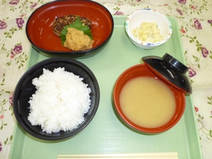 2013年9月28日(土) 2013/9/28 メニュー ◇御飯 ◇和風おろしハンバーグ ◇さつま芋サラダ ◇味噌汁 エネルギー615kcal たんぱく質19.5g 脂質13.0g 炭水化物99.0g 塩分3.6g