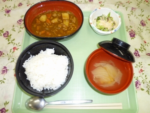 2013年10月1日(火) 2013/10/1 メニュー ◇御飯 ◇チキンカレー ◇サラダ ◇コンソメスープ エネルギー696kcal たんぱく質22.0g 脂質22.3g 炭水化物97.8g 塩分4.3g