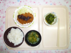 2021年3月8日(月) 2021/3/8 メニュー, 豚肉 ◇御飯 ◇味噌カツ ◇春菊のお浸し ◇清汁 エネルギー649kcal たんぱく質18.3g 脂質16.7g 炭水化物102.5g 食塩3.0g