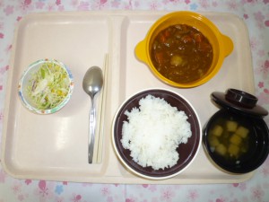 2021年3月9日(火) 2021/3/9 メニュー, 牛肉 ◇御飯 ◇ビーフカレー ◇サラダ ◇コンソメスープ エネルギー716kcal たんぱく質18.2g 脂質24.6g 炭水化物100.1g 食塩4.2g