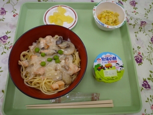 2010年12月23日(木) 2010/12/23 メニュー ◇鮭と茸のクリームスパ ◇フレンチサラダ ◇フルーツ ◇ヨーグルト エネルギー656kcal たんぱく質30.9g 脂質15.6g 炭水化物98.3g 塩分1.9g *参考*