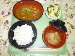 2011年1月4日(火) 2011/1/4 メニュー ◇御飯 ◇ポークカレー ◇グリーンサラダ ◇コンソメスープ エネルギー785kcal たんぱく質22.9g 脂質30.8g 炭水化物98.9g 塩分4.1g
