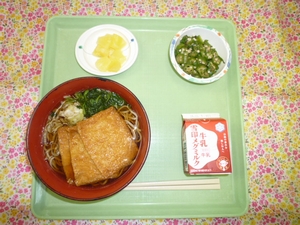 2014年11月27日(木) 2014/11/27 メニュー ◇きつねそば ◇オクラのおかか和え ◇フルーツ ◇牛乳 エネルギー626kcal たんぱく質25.0g 脂質17.0g 炭水化物95.5g 塩分3.4g