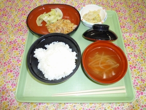 2014年11月30日(日) 2014/11/30 メニュー ◇御飯 ◇鶏肉の香草焼き ◇香味サラダ ◇コンソメスープ エネルギー572kcal たんぱく質21.4g 脂質14.9g 炭水化物84.1g 塩分2.8g