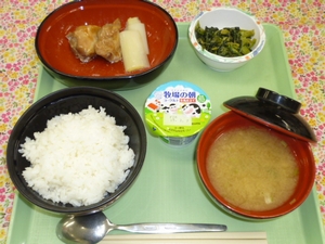 2015年1月26日(月) 2015/1/26 メニュー ◇御飯 ◇鶏肉の照り焼き ◇小松菜の胡麻和え ◇味噌汁 ◇ヨーグルト エネルギー645kcal たんぱく質25.8g 脂質15.3g 炭水化物97.9g 塩分3.2g