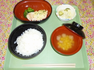 2015年5月13日(水) 2015/5/13 メニュー ◇御飯 ◇鮭のタルタル焼き ◇フレンチサラダ ◇コンソメスープ エネルギー589kcal たんぱく質22.7g 脂質17.0g 炭水化物83.8g 塩分2.5g