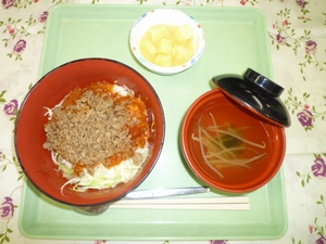 2011年1月26日(水) 2011/1/26 メニュー ◇タコライス ◇さつま芋レモン煮 ◇コンソメスープ エネルギー638kcal たんぱく質26.7g 脂質8.4g 炭水化物103.3g 塩分4.0g