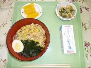 2011年2月10日(木) 2011/2/10 メニュー ◇醤油ラーメン ◇青菜のピリ胡麻風味和え ◇フルーツ ◇牛乳 エネルギー707kcal たんぱく質28.1g 脂質23.8g 炭水化物96.5g 塩分3.8g