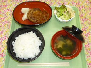 2016年3月8日(火) 2016/3/8 メニュー ◇御飯 ◇チーズハンバーグ ◇グリーンサラダ ◇コンソメスープ エネルギー603kcal たんぱく質19.9g 脂質11.6g 炭水化物102.7g 食塩3.5g