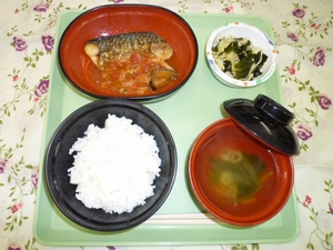 2011年3月23日(水) 2011/3/23 メニュー ◇御飯 ◇鯖のトマトソースかけ ◇青しそ風味サラダ ◇コンソメスープ エネルギー592kcal たんぱく質25.9g 脂質14.7g 炭水化物87.6g 塩分3.5g