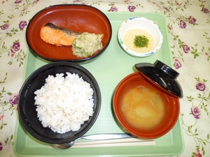 ◇麦御飯 ◇鮭の塩焼き ◇とろろ ◇豚汁 エネルギー578kcal たんぱく質29.9g 脂質7.2g 炭水化物91.3g 塩分2.8g *参考