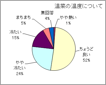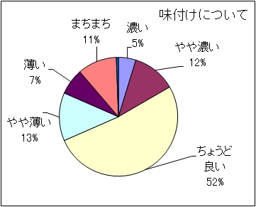 2011年2月の嗜好調査報告 2011/5/20 その他 栄養課情報 大変お待たせ致しました 2月に行いました、入院患者様の嗜好調査の結果です 今回は168名の方にご協力頂きました ありがとうございます 今後もこの結果を基に、より良いお食事の提供を目指して、栄養課一同努力致します。 満足・やや満足が徐々に増えてきました 引き続き良い結果が出せる様、努力致します