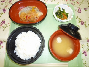2011年5月21日(土) 2011/5/21 メニュー ◇御飯 ◇ホキの甘酢あんかけ ◇小松菜の和え物 ◇味噌汁 エネルギー635kcal たんぱく質25.0g 脂質13.2g 炭水化物101.7g 塩分3.0g