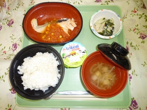 2011年5月30日(月) 2011/5/30 メニュー ◇御飯 ◇さけのイタリアンソース ◇イタリアンサラダ ◇コンソメスープ ◇ヨーグルト エネルギー654kcal たんぱく質25.2g 脂質16.5g 炭水化物98.9g 塩分3.0g