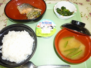 2011年7月25日(月) 2011/7/25 メニュー ◇御飯 ◇鮭の胡麻醤油焼き ◇からし菜のなめ茸和え ◇味噌汁 ◇ヨーグルト エネルギー669kcal たんぱく質27.0g 脂質17.9g 炭水化物98.0g 塩分3.4g