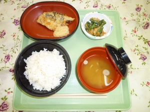 2011年8月20日(土) 2011/8/20 メニュー ◇御飯 ◇鯖の竜田揚げ ◇隠元の辛子和え ◇茄子の味噌汁 エネルギー601kcal たんぱく質22.5g 脂質15.9g 炭水化物86.5g 塩分3.5g