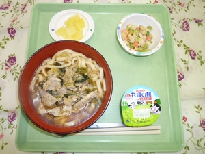 2011年9月22日(木) 2011/9/22 メニュー ◇味噌うどん ◇豆々サラダ ◇フルーツ ◇ヨーグルト エネルギー691kcal たんぱく質30.2g 脂質23.8g 炭水化物87.1g 塩分3.1g