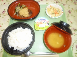 2012年2月6日(月) 2012/2/6 メニュー ◇御飯 ◇おろしハンバーグ ◇マカロニサラダ ◇味噌汁 ◇ヨーグルト エネルギー709kcal たんぱく質23.7g 脂質16.2g 炭水化物110.7g 塩分3.5g
