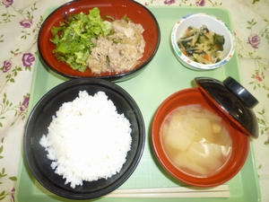 ◇御飯 ◇豚肉の生姜焼き ◇大根サラダ ◇味噌汁 エネルギー783kcal たんぱく質27.9g 脂質34.1g 炭水化物86.0g 塩分2.9g
