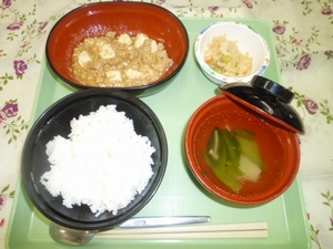 2012年3月10日(土) 2012/3/10 メニュー ◇御飯 ◇麻婆豆腐 ◇棒々鶏サラダ ◇中華スープ エネルギー661kcal たんぱく質32.4g 脂質19.7g 炭水化物84.5g 塩分4.1g