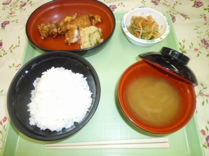 2012年3月24日(土) 2012/3/24 メニュー ◇御飯 ◇鶏肉の竜田揚げ ◇もやしの酢の物 ◇味噌汁 エネルギー664kcal たんぱく質24.0g 脂質21.3g 炭水化物87.2g 塩分3.2g