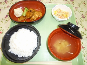 2012年4月18日(水) 2012/4/18 メニュー ◇御飯 ◇タンドリーチキン ◇洋風サラダ ◇ベーコンスープ エネルギー703kcal たんぱく質24.1g 脂質27.6g 炭水化物87.1g 塩分3.5g