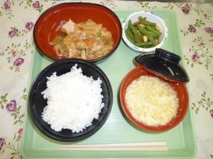 ◇御飯 ◇家常豆腐 ◇隠元の中華和え ◇卵スープ エネルギー696kcal たんぱく質28.2g 脂質24.4g 炭水化物89.4g 塩分3.5g