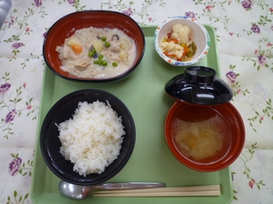 2012年8月5日(日) 2012/8/5 メニュー ◇御飯 ◇クリームシチュー ◇香味サラダ ◇コンソメスープ エネルギー681kcal たんぱく質23.3g 脂質20.5g 炭水化物98.1g 塩分3.3g