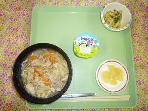 2017年4月20日(木) 2017/4/20 メニュー ◇塩ラーメン ◇コブサラダ ◇パイン缶 ◇ヨーグルト エネルギー694kcal たんぱく質28.6g 脂質23.1g 炭水化物89.3g 食塩4.6g