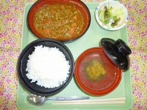 2017年4月26日(水) 2017/4/26 メニュー ◇ご飯 ◇ポークカレー ◇グリーンサラダ ◇コンソメスープ エネルギー671kcal たんぱく質21.3g 脂質19.9g 炭水化物97.4g 食塩4.2g