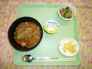 2017年5月8日(月) 2017/5/8 メニュー ◇いかソース焼きそば ◇中華サラダ ◇パイン缶 ◇ヨーグルト エネルギー728kcal たんぱく質28.8g 脂質17.4g 炭水化物109.9g 食塩3.4g