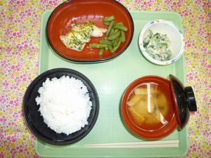 2017年5月30日(火) 2017/5/30 メニュー ◇ご飯 ◇鮭のマヨネーズ焼き ◇菜の花の白和え ◇味噌汁 エネルギー670kcal たんぱく質29.0g 脂質23.8g 炭水化物82.9g 食塩2.7g