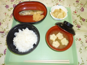 2012年9月18日(火) 2012/9/18 メニュー ◇御飯 ◇秋刀魚の塩焼き ◇和風サラダ ◇味噌汁 エネルギー674kcal たんぱく質25.7g 脂質23.8g 炭水化物81.0g 塩分3.2g