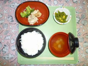 2017年8月29日(火) 2017/8/29 メニュー ◇ご飯 ◇鶏のマスタード焼 ◇アスパラサラダ ◇コンソメスープ エネルギー687kcal たんぱく質24.0g 脂質27.0g 炭水化物83.5g 食塩2.8g